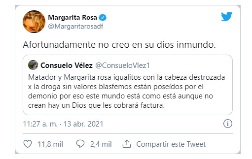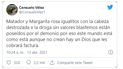 “Matador y Margarita Rosa, igualitos, con la cabeza destrozada por la droga, sin valores, blasfemos, están poseídos por el demonio. Por eso este mundo está como está; aunque no crean, hay un Dios que les cobrará factura”, fue el mensaje de la usuaria publicado en la red social Twitter.