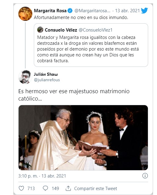 En otras respuestas a Margarita Rosa, varios internautas compartieron una imagen de la boda católica de la actriz con Carlos Vives, recordándole que fue un rito católico.