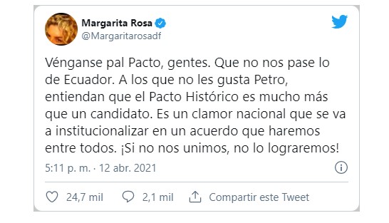 “Vénganse pa’l Pacto, gentes. Que no nos pase lo de Ecuador. A los que no les gusta Petro, entiendan que el Pacto Histórico es mucho más que un candidato. Es un clamor nacional que se va a institucionalizar en un acuerdo que haremos entre todos. ¡Si no nos unimos, no lo lograremos!”, trinó la escritora.