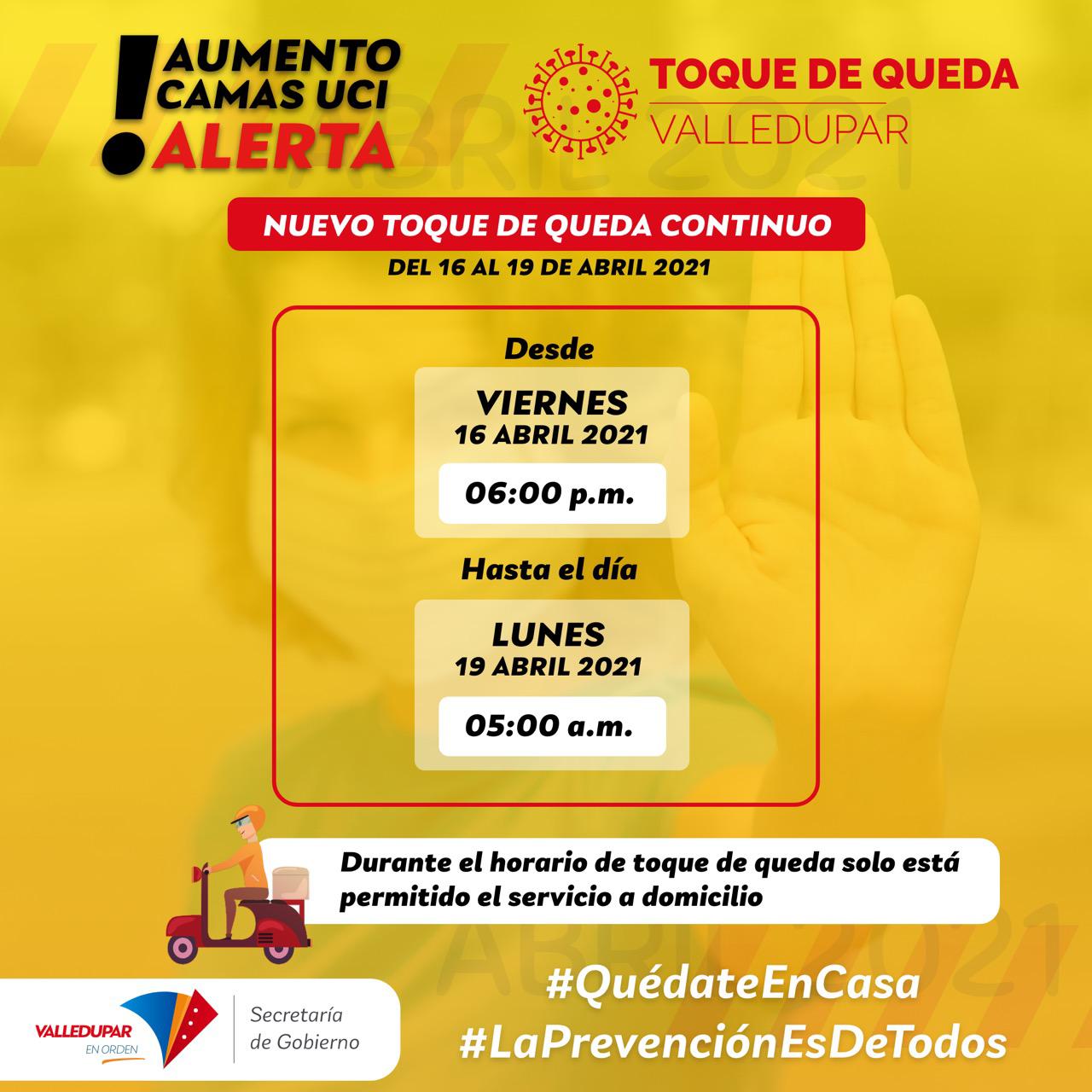 En coordinación con el Gobierno Nacional y la Gobernación del Cesar se decreta toque de queda desde hoy a las 6:00 pm hasta el lunes 19 de abril a las 5:00 am. Se permitirá servicio de domicilios y vacunación contra COVID y otras excepciones. pic.twitter.com/LJ7MiQH2Dl