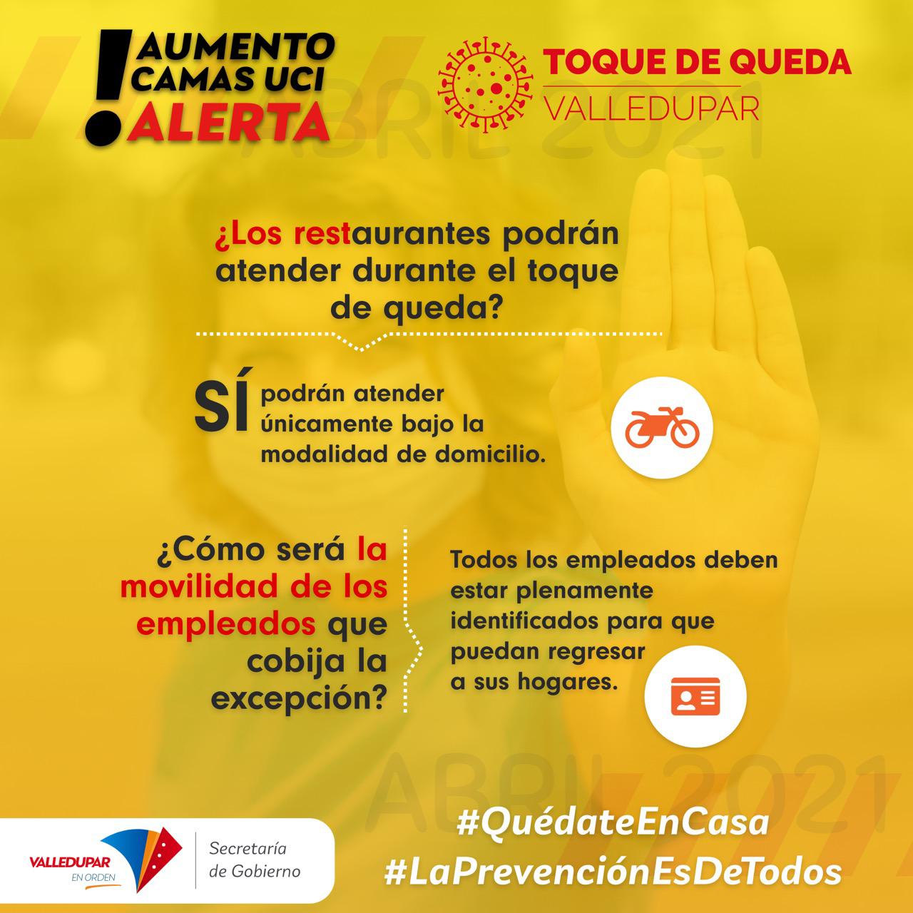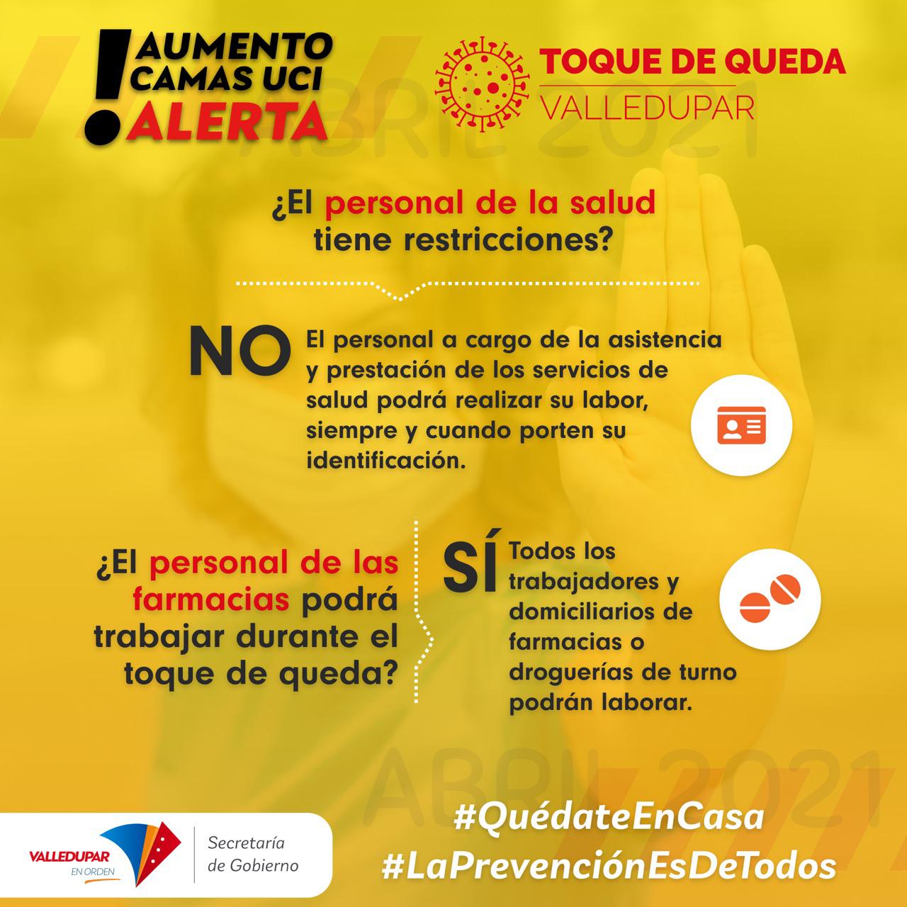 En coordinación con el Gobierno Nacional, Gobernación del Cesar y Alcaldía de Valledupar se decreta toque de queda desde hoy a las 6:00 p.m hasta el lunes 19 de abril a las 5:00 a.m. Se permitirá servicio de domicilios, vacunación contra COVID-19 y otras excepciones.