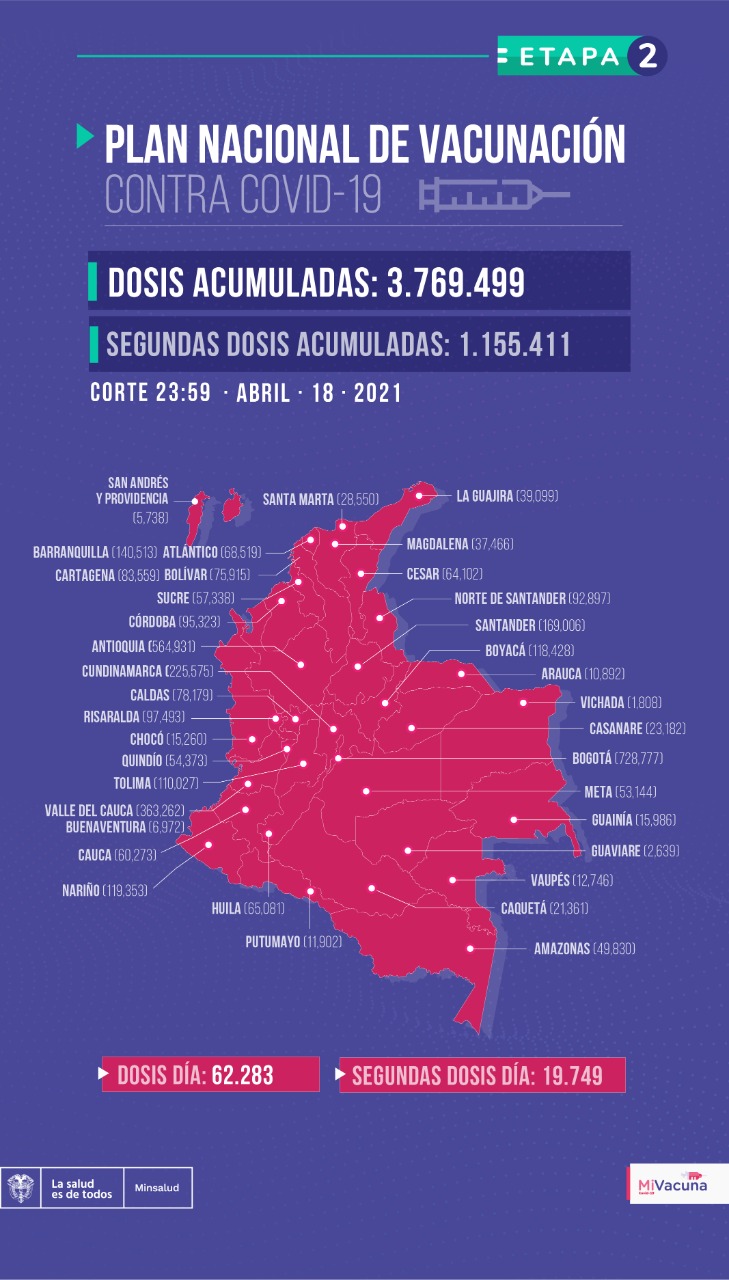 En el país se han aplicado más de 3.769.499 vacunas contra el coronavirus. A la fecha van 1.155.411 colombianos que han recibido la segunda dosis y están inmunizados por completo.