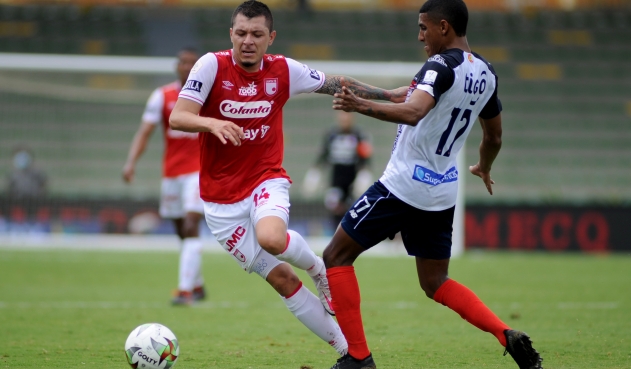 Daniel Giraldo de Santa Fe también lo intentó en el minuto 31 tras un centro desde el costado derecho del campo con Carlos Arboleda, pero el volante no logró conectar de cabeza la pelota y se perdió una nueva llegada de gol para el ‘león’.