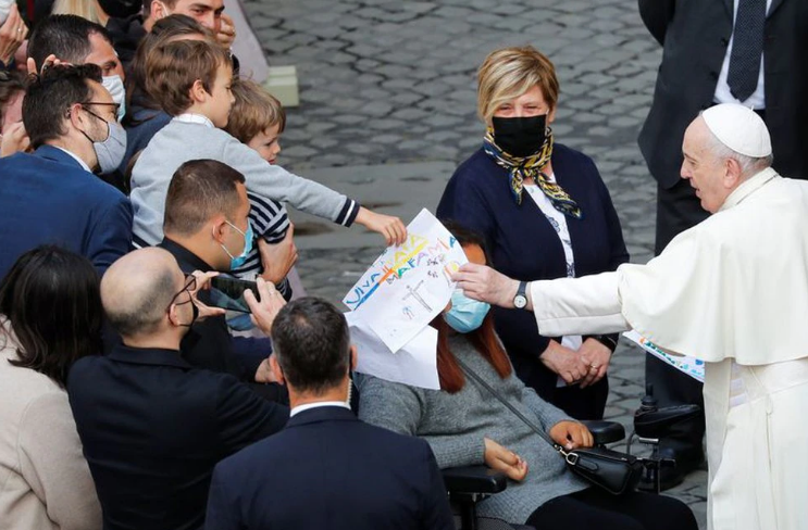 El papa, que llegó en coche al patio y no llevaba mascarilla, se detuvo, aunque manteniendo la distancia, a hablar con los fieles, recibió regalos, diseños de niños y bendijo a una mujer en silla de ruedas que se encontraba en primera fila.