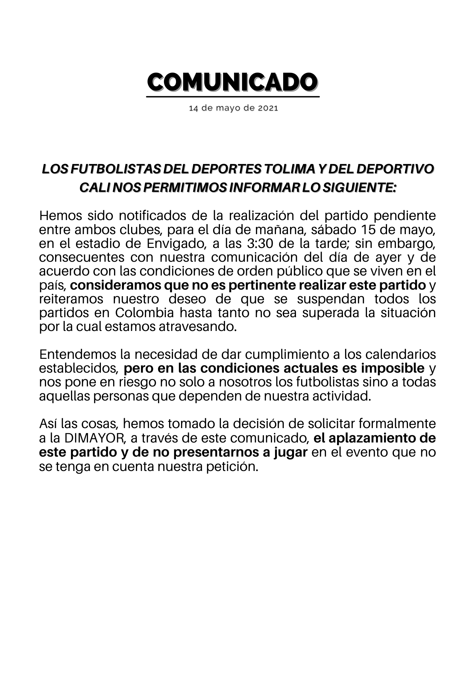 “Pese a la solicitud de los futbolistas colombianos, al no existir condiciones para la realización de partidos en Colombia, los futbolistas del Deportivo Cali y Deportes Tolima, reciben órdenes de clubes y Dimayor de jugar mañana (sábado) en Envigado, exponiendolos a un riesgo innecesario”, dijo la agremiación en sus redes sociales.