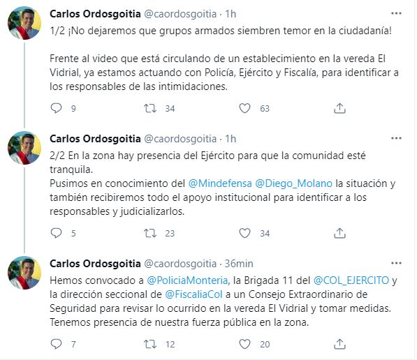 Ante este inusual hecho, el alcalde de Montería, Carlos Ordosgoitia, se pronunció en su cuenta de Twitter indicando que “¡No dejaremos que grupos armados siembren temor en la ciudadanía! Frente al video que está circulando de un establecimiento en la vereda El Vidrial, ya estamos actuando con Policía, Ejército y Fiscalía, para identificar a los responsables de estas intimidaciones”.