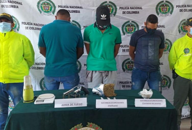 La acción judicial se desarrolló en el barrio 20 de Julio, logrando la captura de Frank García alias “Frank”, José María Fontanilla alias “Joche” y Justin Palacio alias “Justin”, a quienes se les fue incautada un arma de fuego tipo revolver calibre 38, 500 gramos de marihuana y cocaína dosificada.
