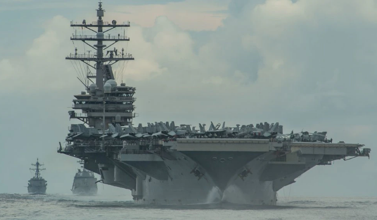 El portaaviones está acompañado por el crucero de misiles guiados USS Shiloh y el destructor de misiles guiados USS Halsey, añadió.