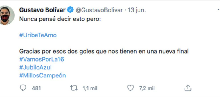 “Nunca pensé decir esto pero: #UribeTeAmo. Gracias por esos dos goles que nos tienen en una nueva final #VamosPorLa16 #JubiloAzul #MillosCampeón”, escribió en su cuenta oficial de Twitter. El mensaje ya alcanza más de 7.000 ‘me gusta’ y fue retuiteado más de 1.000 veces.