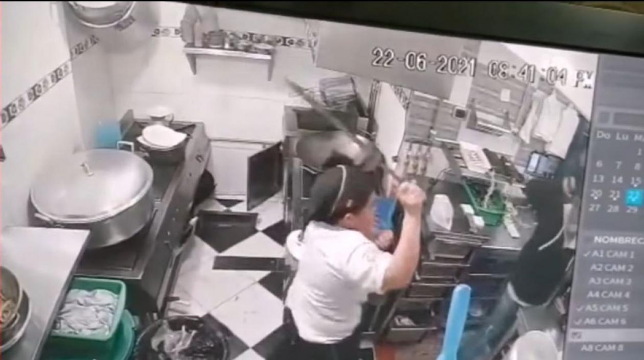 Las imágenes muestran el ingreso de los cuatro antisociales y la manera cómo intimidan con arma de fuego a un cliente que salía en ese momento. Sin embargo, cuando los antisociales llegaron a la zona de la cocina se encontraron de frente con una valiente mujer que machete en mano se defendió.