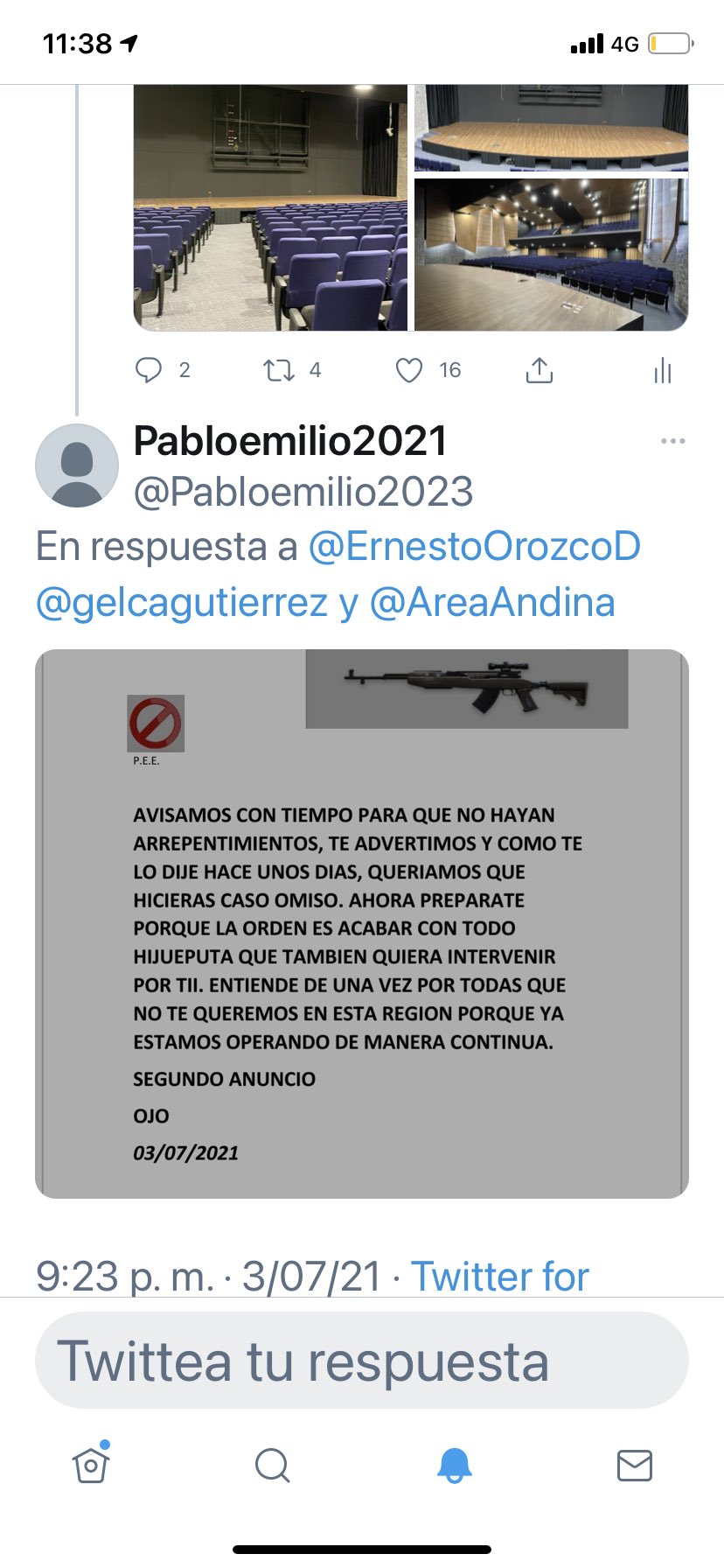 Frente a ello, Orozco Durán manifestó igualmente por la misma red social, «Por aquí hay unos q les toca usar cuentas falsas para amenzarme porque no tienen pantalones, al tal @Pabloemilio2023 solo le digo q cuando quieras, pero pon la cara».