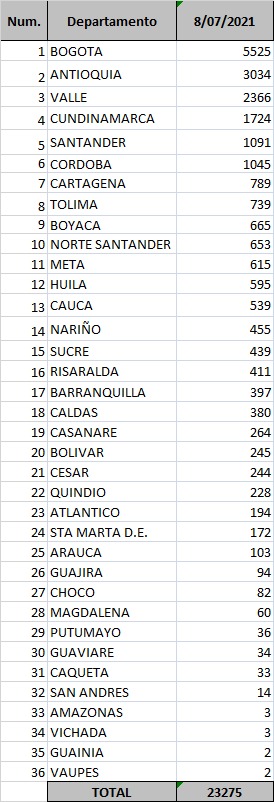 Casos de Covid-19 por regiones de Colombia a 8 de julio de 2021