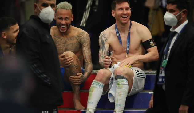 Tras la ceremonia de premiación, los tres grandes del fútbol sudamericano se sentaron en el filo de una escalera sin camisetas y fueron captados entre risas, como grandes amigos.