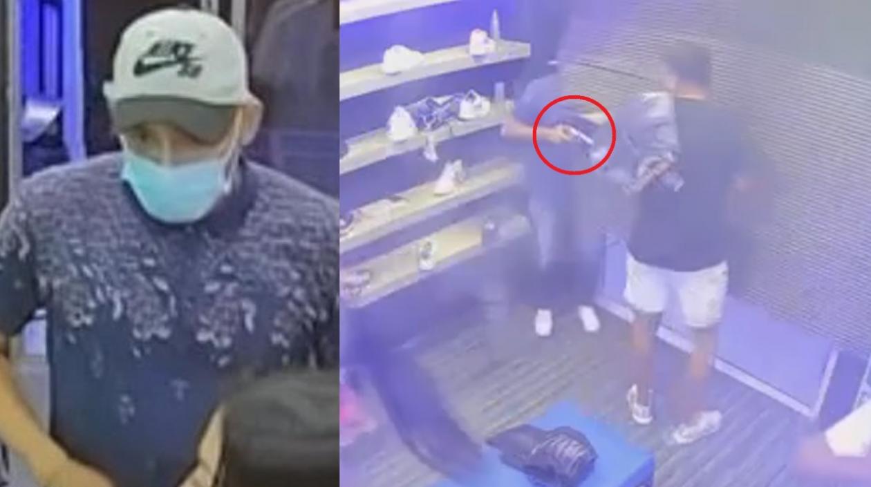 Cámaras de seguridad grabaron el momento en que el delincuente ingresó primero a un local de al lado e intimidó con el arma a una mujer, pero como no encontró nada de valor para robar la amenazó y la hizo ir hasta el establecimiento de zapatos de al lado.