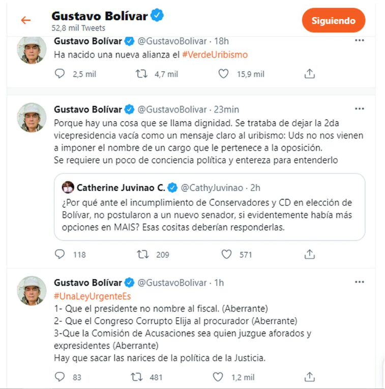 Sobre el tema, Gustavo Bolívar hizo duros cuestionamientos a Angélica Lozano, Antonio Sanguino y otros miembros del partido del girasol. Tanto en Twitter, como en diálogo con la emisora W Radio, el también escritor acusó a esa colectividad de unirse con el uribismo para impedir que él llegara a la vicepresidencia de esa corporación.