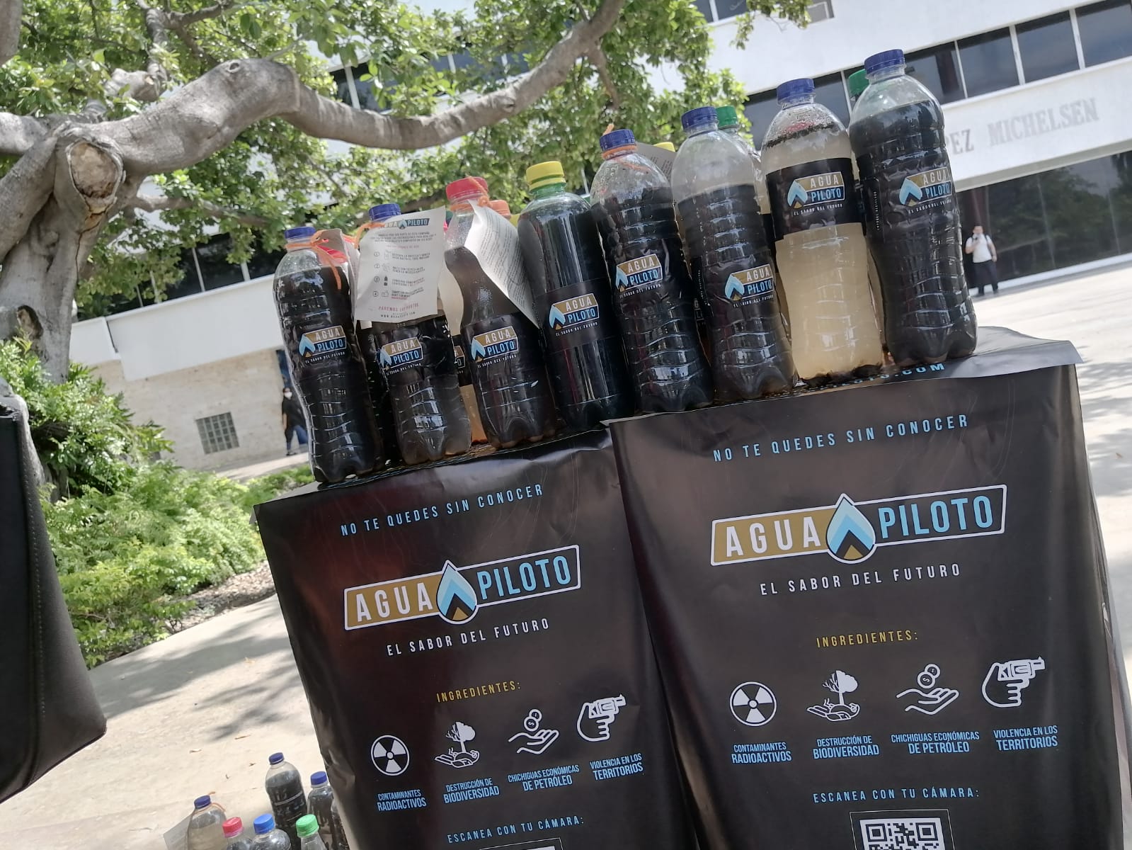 ‘Agua Piloto: el sabor del futuro’ es un producto embotellado que muestra un líquido sucio y en etiqueta dice que contiene: uso de inmensas cantidades de agua, impactos en la salud, contaminación del aire, agrava la crisis climática, uso de químicos tóxicos, radioactividad, violencia en los territorios y destrucción de la biodiversidad.