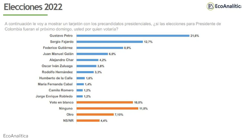 A menos de 10 meses de la primera vuelta presidencial, el senador y jefe del partido Colombia Humana, Gustavo Petro, sigue encabezando las encuestas de intención de voto para las elecciones que definirán al próximo jefe de Estado en 2022. Así lo evidenciaron los resultados del nuevo estudio ‘Percepción País’, realizado por EcoAnalítica y que se conocieron en la mañana de este jueves.