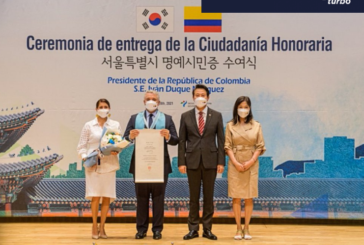 La reunión del presidente Iván Duque con el alcalde de la capital surcoreana de Seúl estuvo llena de reconocimientos simbólicos. Durante ese encuentro, el mandatario recibió la ciudadanía honorífica de la ciudad y allí también le sería otorgado un doctorado honoris causa de la Universidad de Yonsei.
