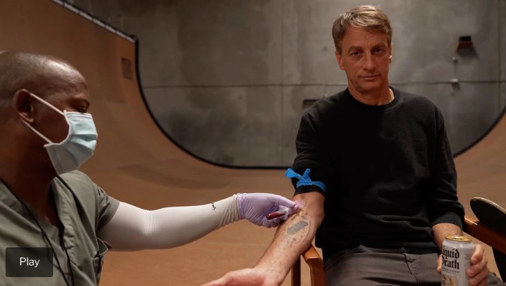 “No sé, es muy confuso. Me están sacando sangre y la van a usar para gráficos de patinetas”, agrega mientras que alguien llena un tubo de laboratorio con la sangre del patinador.