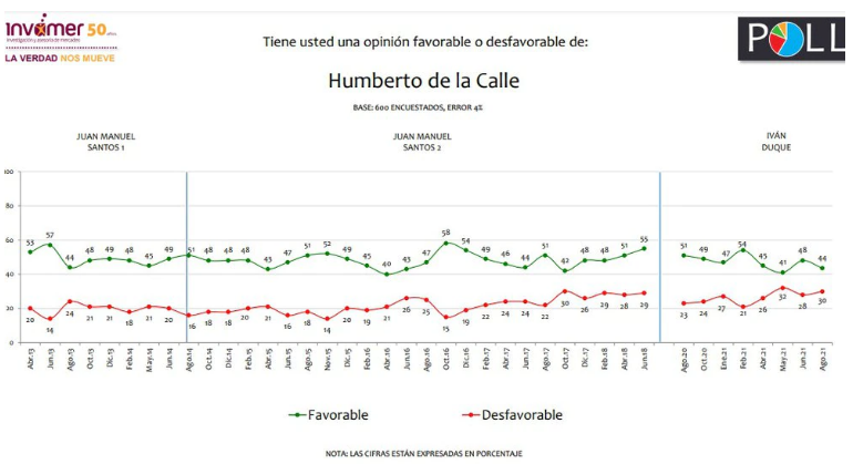 En el caso de Humberto de la Calle, jefe del equipo negociador de los Acuerdos de Paz con las Farc en la Habana, su favorabilidad tuvo una caída de cuatro puntos respecto a la última medición de la encuestadora en el mes de junio, cuando su aprobación estuvo en 48%. Hasta el momento, sus mejores cifras de aceptación las tuvo entre octubre de 2016 y febrero de 2017, donde su favorabilidad estuvo entre el 58% y el 49% respectivamente.