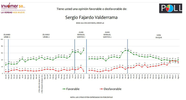En el caso del exgobernador de Antioquia y exalcalde de Medellín, Sergio Fajardo, sus mejores cifras las tuvo entre junio y agosto del 2018, cuando su aprobación estuvo en 67%. Desde la fecha, su imagen positiva ha ido cayendo de a poco, hasta que en junio de este año la cifra reportada por Invamer fue de 37%.