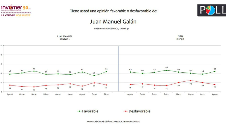 Por otra parte, la favorabilidad de Juan Manuel Galán en lo que va de 2021, de acuerdo con la encuesta, se ha mantenido sobre el 40% a excepción del mes de junio cuando su aprobación estuvo en un 38%. En cuanto a su imagen negativa, el exsenador tiene al mes de agosto una de las más bajas de todos los precandidatos consultados: 16%.