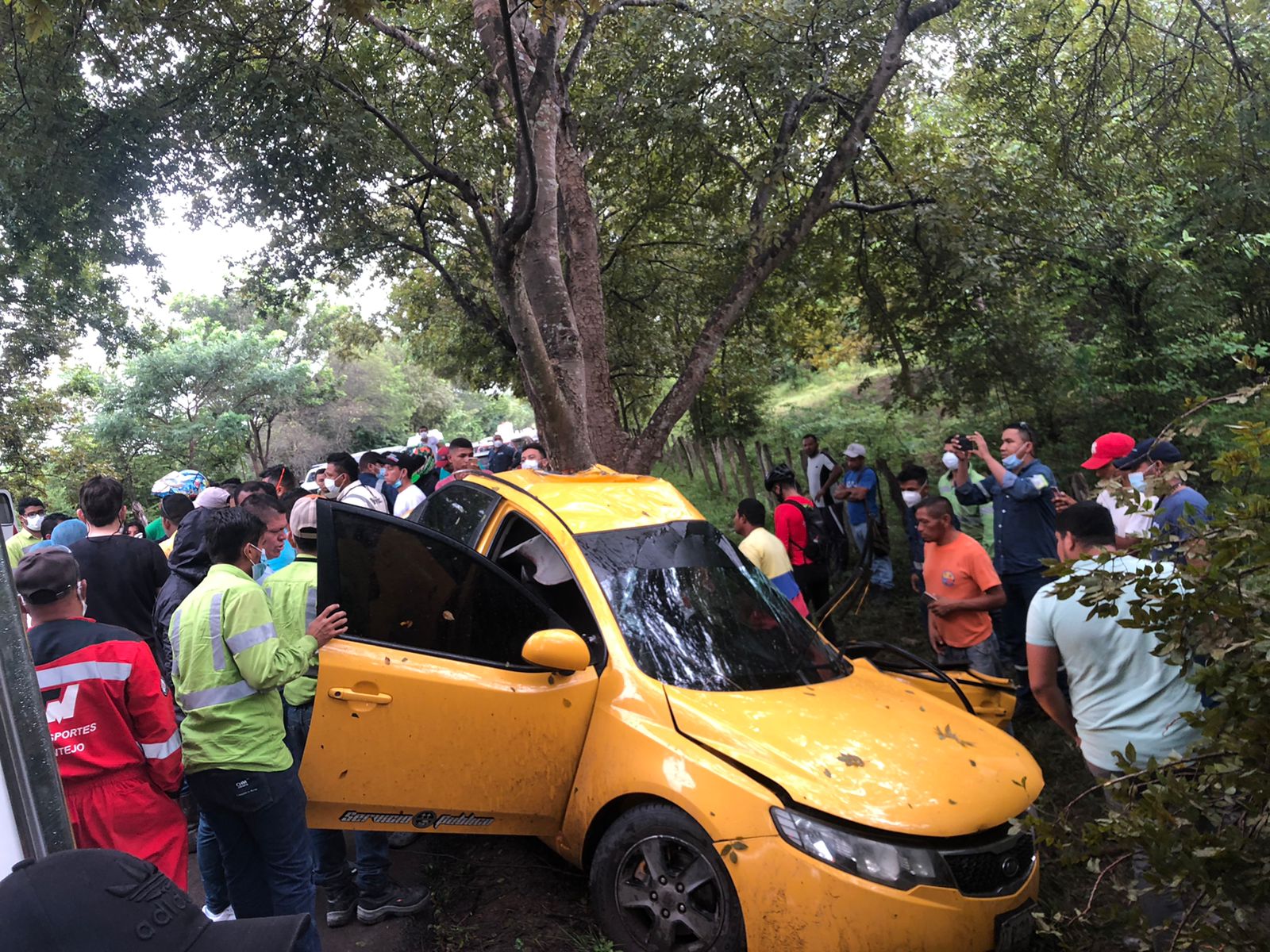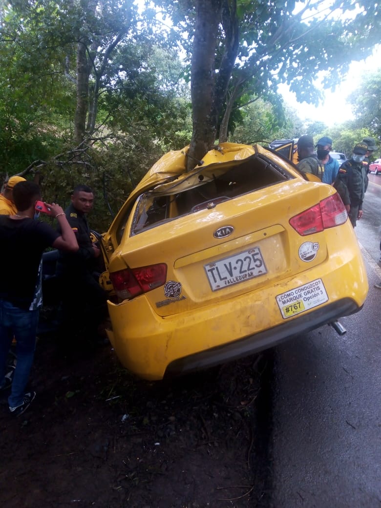 El siniestro se produjo según las autoridades debido a la humedad de la carretera por las fuertes lluvias que han caído en la región, más la falta de precaución del conductor lo cual hizo que perdiera el control del taxi hasta terminar estrellado contra un árbol.