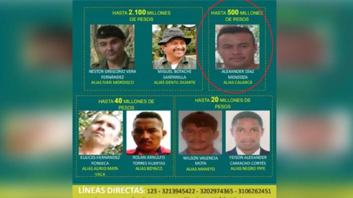 Son 500 millones de pesos los que ofrece la institución por la ubicación de un sujeto identificado como Alexander Díaz Mendoza, conocido con el alias de ‘Calarcá’, y quien sería el cabecilla del Grupo Armado Organizado Residual 40, estructura responsable de la muerte del patrullero Kevin Guevara oriundo de Melgar, Tolima y el neivano Víctor Alfonso Rojas, quien murió de manera instantánea en el lugar de los hechos.