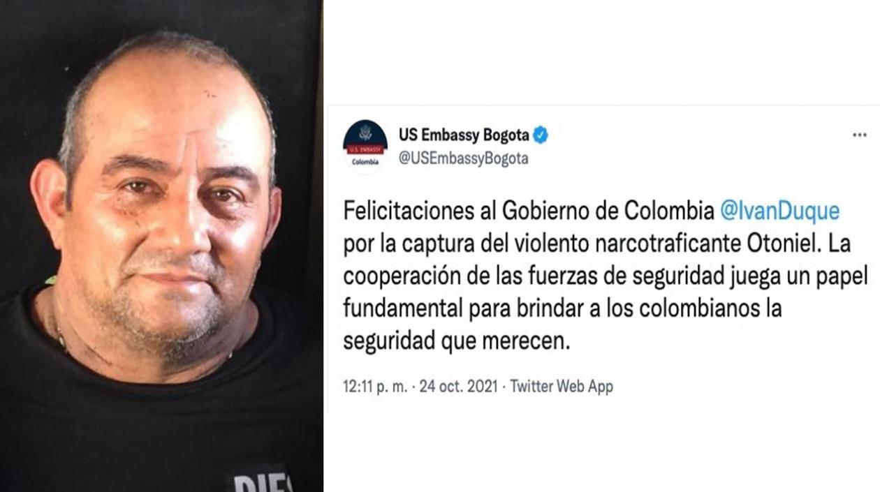 “Felicitaciones al Gobierno de Colombia @IvanDuque por la captura del violento narcotraficante Otoniel. La cooperación de las fuerzas de seguridad juega un papel fundamental para brindar a los colombianos la seguridad que merecen”, reseña la Embajada en su cuenta de Twitter.