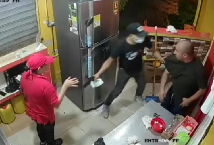 En las imágenes de una cámara de seguridad se observa la manera en que el delincuente encañona al dueño y un empleado para hurtar el dinero de una caja registradora.