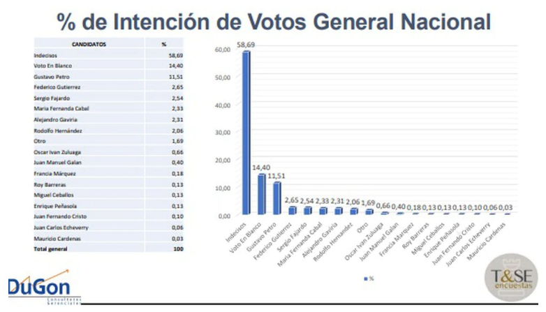 En este sentido los resultados expuestos en esta encuesta mostraron que pese a que Gustavo Petro sigue consolidando un electorado importante, aun no hay una decisión definitiva por parte de toda la población colombiana y se esta transformando el panorama de cara a las presidencial. Además, la incertidumbre y confusión son hasta el momento los pensamientos que prevalecen. Sumado a esto se nota una alta confusión asociada a la gran cantidad de candidatos lo que podría cambiar cuando las coaliciones escojan sus candidatos unidos.