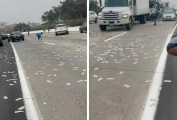 En un vídeo publicado en redes sociales se ve a conductores corriendo por la calzada, recogiendo dinero en efectivo e incluso lanzando puñados de billetes verdes al aire en señal de celebración.