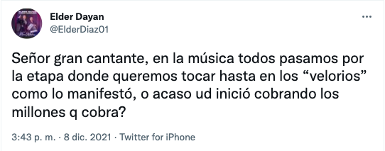 Su comentario no cayó muy bien y Elder Dayán no se quedó callado. Le respondió en su cuenta de Twitter