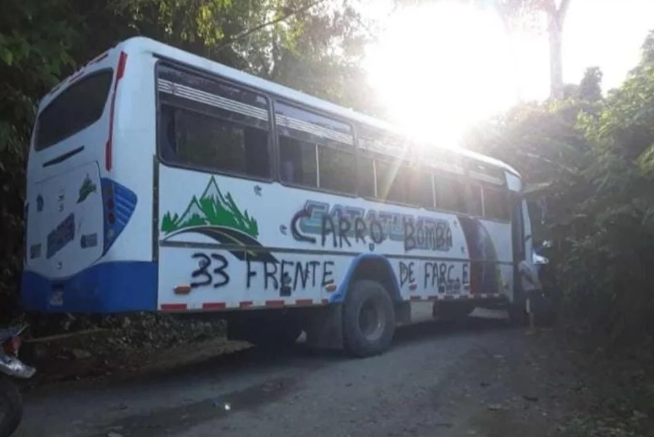 Un bus de servicio fue atravesado en la vía que conduce del municipio de Tibú a El Tarra en la zona del Catatumbo en Norte de Santander. El vehículo fue pintado con advertencia de “bus bomba” y siglas del “Frente 33 de las Farc”.