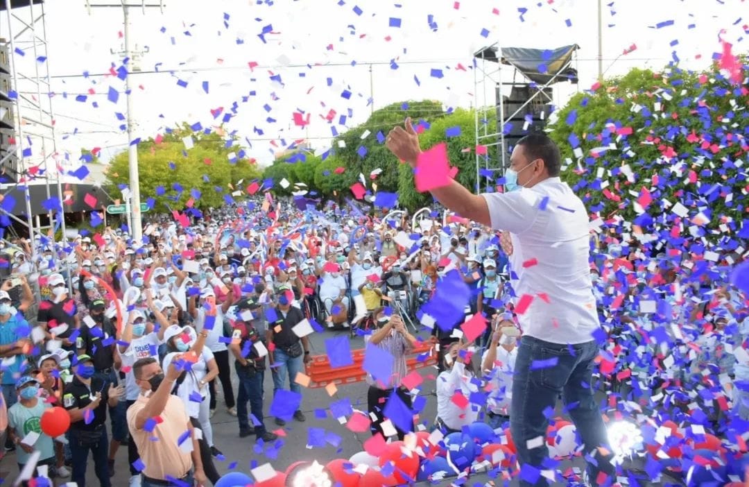 Entre colores blanco, azul y rojo, ciento de seguidores lo acompañaron en el evento, que además contó con los protocolos de bioseguridad para evitar contagios por Covid-19, incluso fue instalado un puesto de vacunación como parte del compromiso que toda la comunidad debe tener frente a la pandemia.