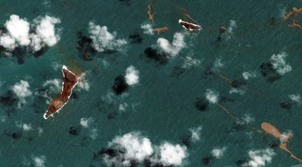 Fotografías recientes del Centro de Satélites de las Naciones Unidas (UNOSAT) revelan que a raíz de la erupción del volcán Hunga Tonga Hunga Ha’apa solo quedan dos pequeñas porciones de tierra sobre el nivel del mar.
