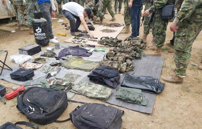 De acuerdo con las Fuerzas Armadas, la base de descanso pertenecería a grupos ilegales armados. El personal militar decomisó una ametralladora, seis granadas de mano, más de 2.200 municiones de distinto calibre, 21 alimentadoras fusil M16, cuatro chalecos de combate, una cocina, tres mochilas, tres baterías para paneles solares, 1.156 pesos colombianos, prendas de vestir y camisetas y sombreros con los emblemas del Frente Oliver Sinisterra.