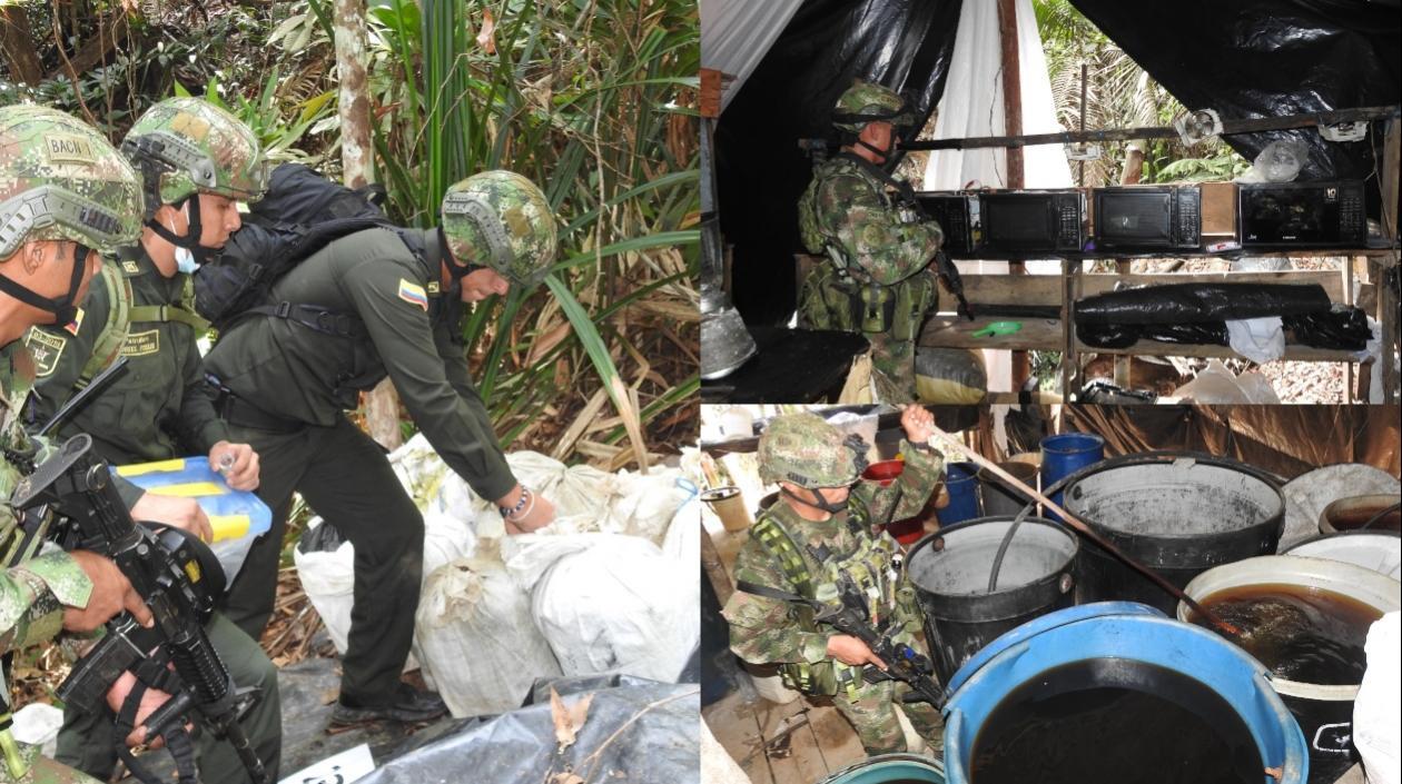 La información del Ejército agregó que en la rústica estructura también fueron destruidos más de 3.000 galones de insumos líquidos y 4.900 kilogramos de insumos sólidos, como cal, soda cáustica y otros precursores químicos empleados para el procesamiento de coca.