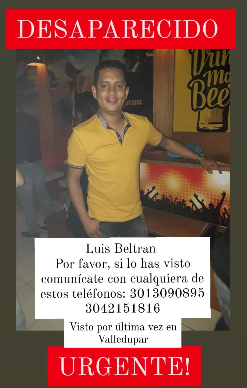 En este sentido, pidió que cualquier información que sea útil para saber el paradero de Luis Alfonso Beltrán Herrera puede hacerse a través de los celulares 3013090895- 3042151816.