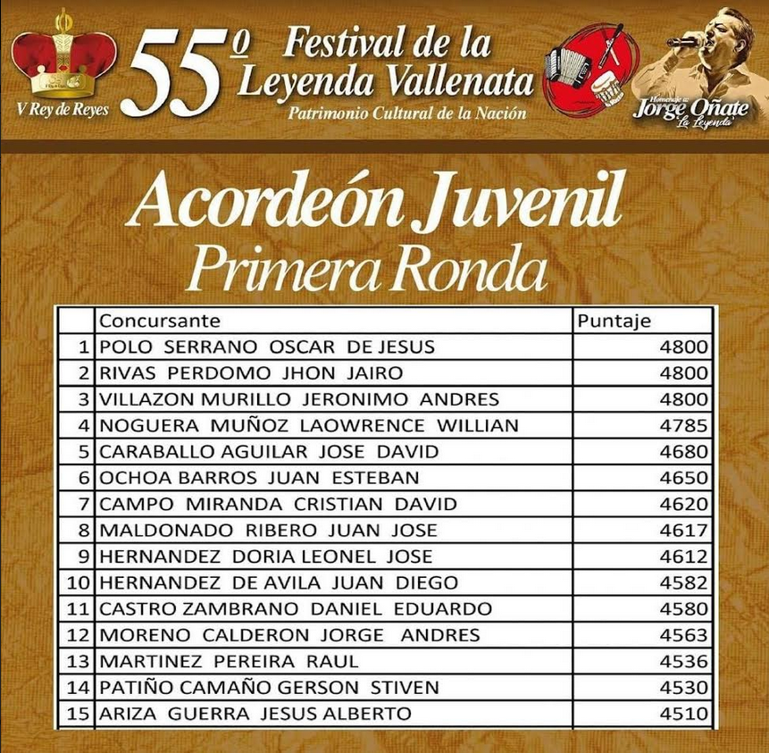 En el caso de la categoría Acordeón Juvenil 15 DE 29 adolescentes pasaron a segunda ronda por la corona. Cumplieron una primera ronda con los aires Paseo y Merengue; y ayer se midieron en Son y Puya, para lograr el grupo de precalificados a la segunda etapa que se vivirá en el Centro Recreacional La Pedregosa.