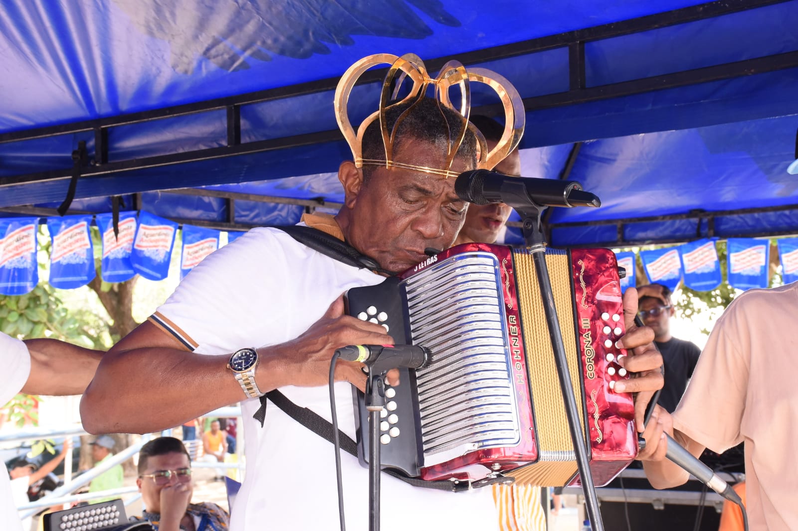 El rey, acordeón al pecho, exhibió la corona que lo acredita por cinco años como el máximo jerarca de la música vallenata, lo que llenó de entusiasmo a los Mariangoleros, quienes sacaron la bandera colombiana como manifestación de orgullo de la dinastía que los representa culturalmente ante el mundo musical.
