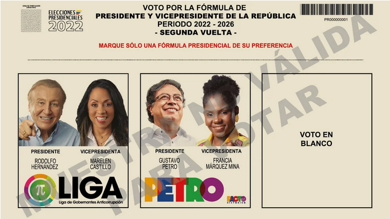 A menos de 20 días de la segunda vuelta presidencial en Colombia, durante la mañana de este jueves 2 de junio, se conoció cómo quedará el tarjetón que los colombianos depositarán en las urnas el próximo 19 de junio para definir al próximo jefe de Estado, entre los candidatos Gustavo Petro y Rodolfo Hernández.