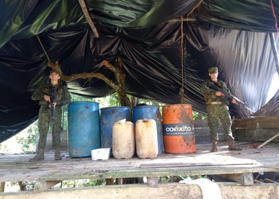 Finalmente, tropas del Batallón Fluvial de Infantería de Marina No. 40 se desplegaron en área general del río Mira, zona rural de Tumaco, ubicaron y posteriormente destruyeron de forma controlada dos laboratorios empleados para el procesamiento de pasta de base de coca, perteneciente al grupo disidente de las Farc “Iván Ríos”, en el que fueron inutilizados 540 galones de base de coca en proceso, 299 galones de insumos líquidos y 81 kilogramos de insumos sólidos.
