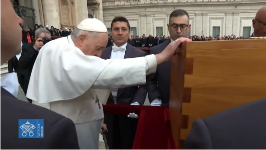 Poco antes de que el ataúd con el cuerpo de Benedicto XVI fuera ingresado a la Basílica de San Pedro rumbo a las Grutas vaticanas, el Papa Francisco se puso de pie para tocar el ataúd y orar sentidamente.