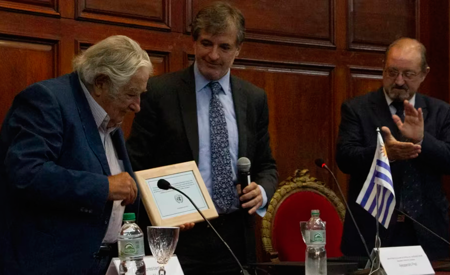 Mujica, quien fue jefe de Estado en su país para el periodo 2010-2015, recibió el reconocimiento en una ceremonia que se realizó en el paraninfo de la Universidad de la República en Montevideo, donde el encargado de entregarle la placa conmemorativa fue el mismo jefe de reincorporación de la Misión de Verificación de las Naciones Unidas en Colombia, Alessandro Preti.