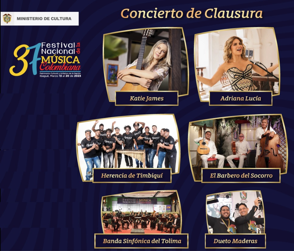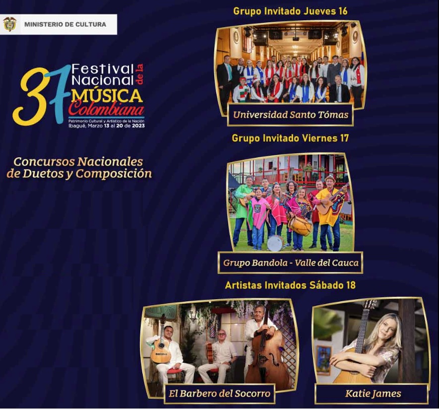 En cuanto a la agenda del 37 Festival Nacional de Música Colombiana¸ evento que ha sido reconocido como Patrimonio Cultural y Artístico de la Nación, se incluyen, entre otros: el Concurso Nacional de Duetos Príncipes de la Canción, el Departamental de interpretación Cantalicio Rojas y los encuentros Musicales De las Regiones y el Departamental de Duetos Silva y Villalba, toda una oferta cultural que se puede consultar en la página oficial del festival y por supuesto; en las redes sociales de SAYCO.Invitamos a todos nuestros seguidores y amantes de la música tradicional colombiana a seguir minuto a minuto y por qué no a visitar Ibagué para disfrutar, además de la música, de la amabilidad de sus gentes, gastronomía y paisajes.