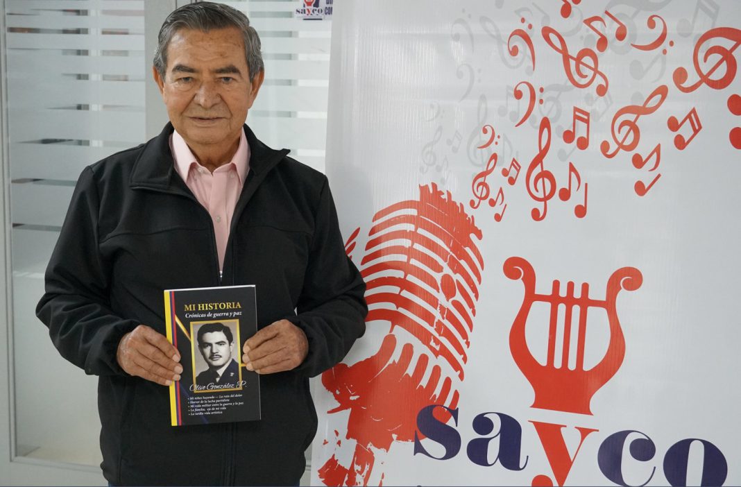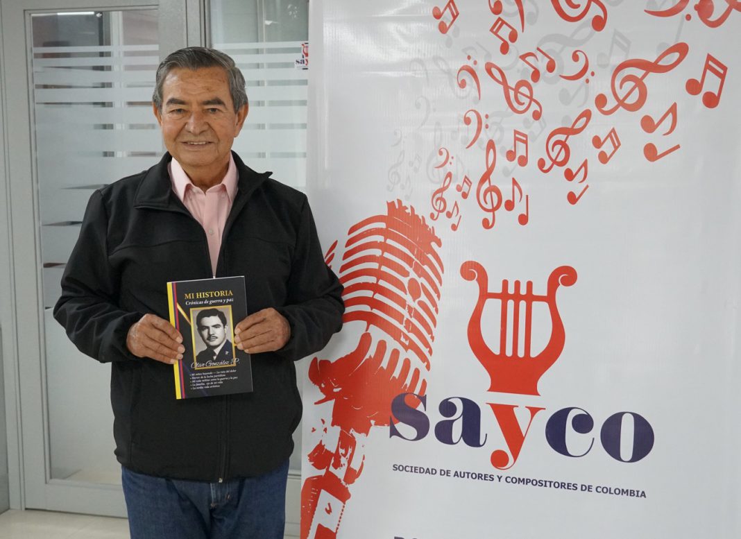 Con profundo respeto y admiración, SAYCO recibió en días pasados la grata visita del Maestro nortesantandereano Olivo González Pedraza, un militar retirado y cantautor, quien a sus 90 años de edad se lanzó a la extraordinaria aventura de escribir su libro “Mi historia… Crónica de Guerra y Paz”, un emocionante y detallado recuento de su vida. Allí nos cuenta Don Olivio su niñez y vida familiar y cómo huyó al horror de la lucha partidista que vivía Colombia, y luego su ejercicio militar entre la guerra y la paz. Y por supuesto, también nos confiesa como se inició a los 80 años en arte de cantar y componer.