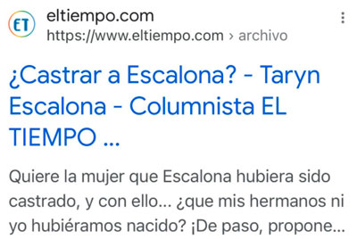 Ante esta inaceptable referencia, Taryn Escalona, hija de Rafael Escalona, respondió a la periodista de la misma manera, con su pluma, a través de una columna publicada en el diario El Tiempo titulada: “¿Castrar a Escalona?”