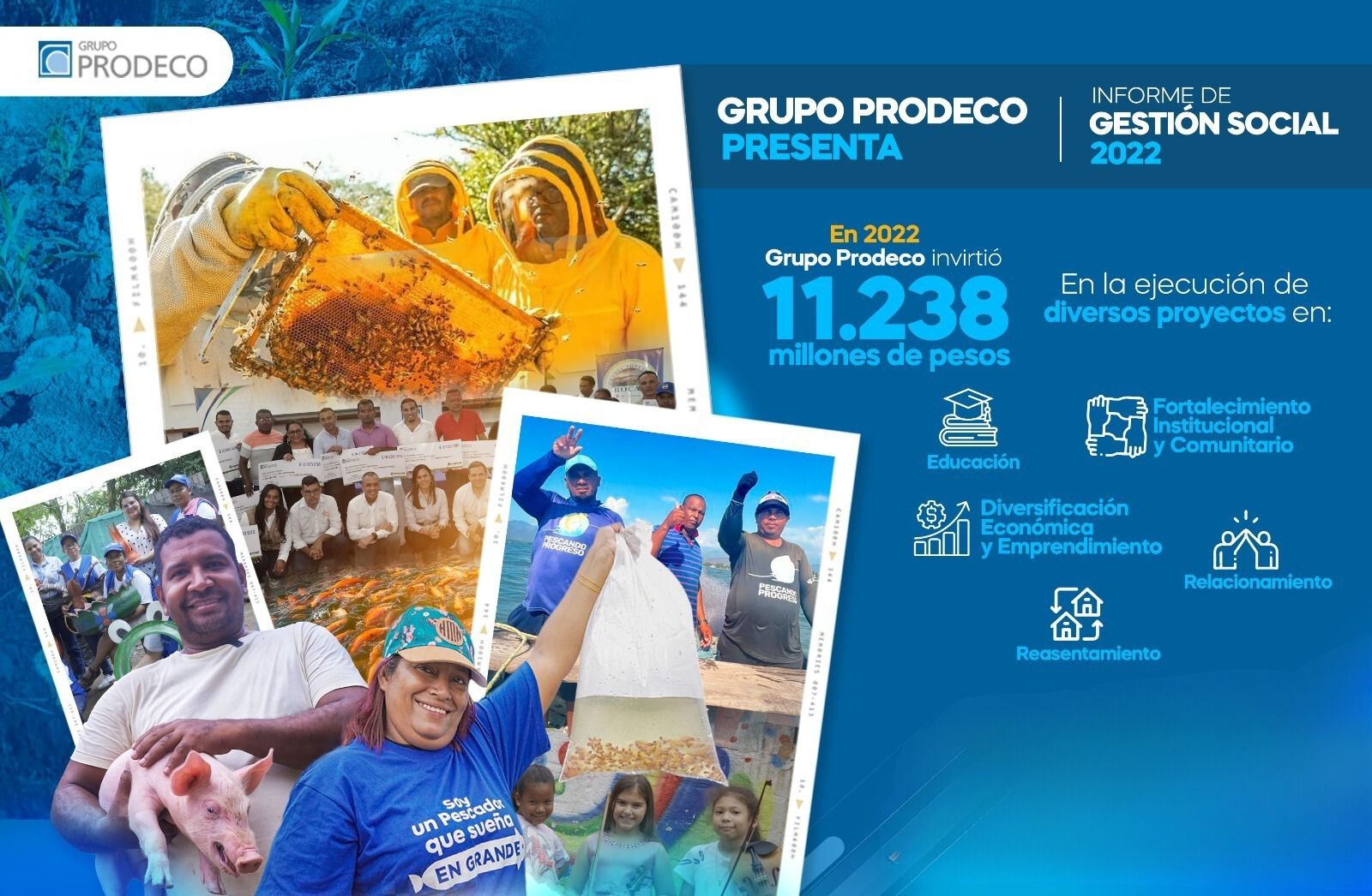 En su Informe de Gestión Social 2022, el Grupo Prodeco presenta los avances y logros de sus proyectos y sus principales inversiones, entre las que se destacan el programa de becas universitarias; el fortalecimiento al emprendimiento a través de formación y capitalización; los proyectos piscícolas con más de 97 familias de pescadores artesanales beneficiadas; los proyectos agropecuarios y apícolas que benefician a más de 200 familias en el Cesar; los programas y obras en ejecución en cumplimiento del Plan de Manejo Socioeconómico (PMS) de Boquerón; y las actividades ejecutadas en el marco del proceso de Reasentamiento. Adicionalmente, la compañía donó recursos para ayudar a mitigar los impactos causados por la ola invernal que se vivió a finales de 2022 en La Jagua de Ibirico, Cesar.