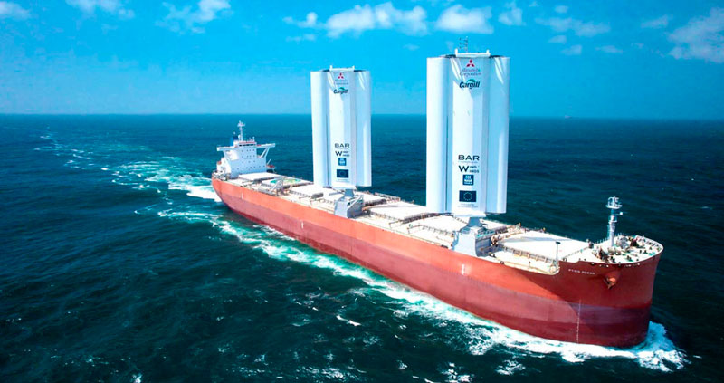 El granelero fue desarrollado por BAR Technologies, Mitsubishi Corporation y Yara Marine Technologies, y realiza el viaje de prueba dotado de dos grandes velas WindWings que miden hasta 37,5 metros de altura y que se pueden instalar en la cubierta de otros buques de carga para aprovechar la energía del viento.